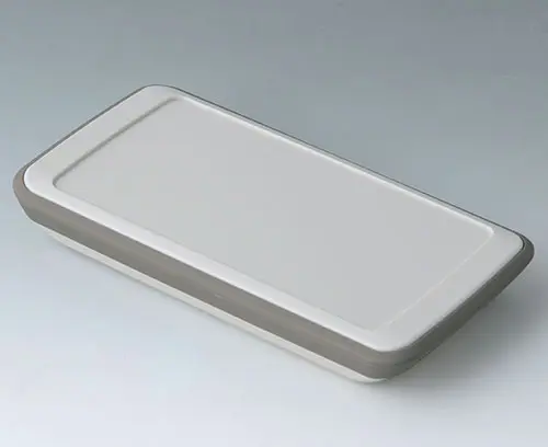 3-piece handheld enclosure with TPE intermediate ring, compact design, with a large operating panel of up to 4" (10 cm). Comfortable grip thanks to enclosure contours that are rounded along the sides and intermediate ring made of TPE, which also serves as impact protection and as a sealing ring for protection class IP 54. Recessed operating panel for using a contoured transparent front screen (available as an accessory with adhesive film) or for protecting individual membrane keyboards. Fastening pillars for mounting PCBs in top and bottom parts.