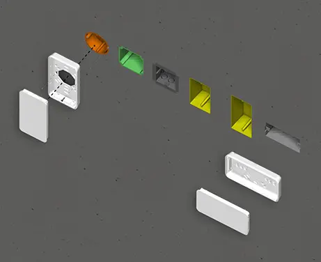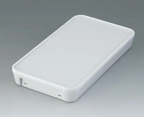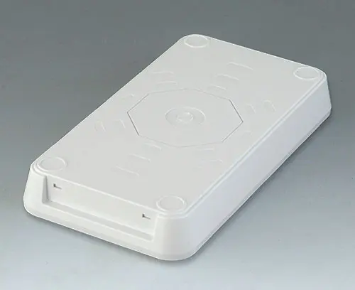 Elegant two-part plastic enclosure with flat top part. Fastening pillars for PCBs and components in the top part. Bottom part with a series of pre-moulded cut-outs for assembly on standard flush-mounted/cavity wall boxes (machining required). Secure snap-in assembly of top and bottom parts. Rational assembly of the electronics. To open the enclosures easily and practically, we recommend that you use the opening tool set, which is available as an accessory. Recessed operating area protects a membrane keyboard or glass control panel. Resin hardboard protection plate, glass panel, adhesive foil and opening tool available as accessories. Due to the high-quality material (UL 94 V-0) and the elegant design, perfect for use in modern building services technology.