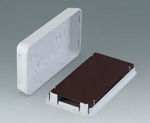 SMART-PANEL E155 Elegant two-part plastic enclosure with flat top part. Fastening pillars for PCBs and components in the top part. Bottom part with a series of pre-moulded cut-outs for assembly on standard flush-mounted/cavity wall boxes (machining required). Secure snap-in assembly of top and bottom parts. Rational assembly of the electronics. To open the enclosures easily and practically, we recommend that you use the opening tool set, which is available as an accessory. Recessed operating area protects a membrane keyboard or glass control panel. Resin hardboard protection plate, glass panel, adhesive foil and opening tool available as accessories. Due to the high-quality material (UL 94 V-0) and the elegant design, perfect for use in modern building services technology.