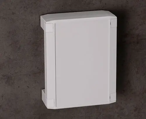 Fastening pillars for PCBs or mounting plates in the bottom and top parts. Bottom part also with two pillars for mounting a DIN rail and with pre-molded mounts for use with VESA 100x100 standard holders.