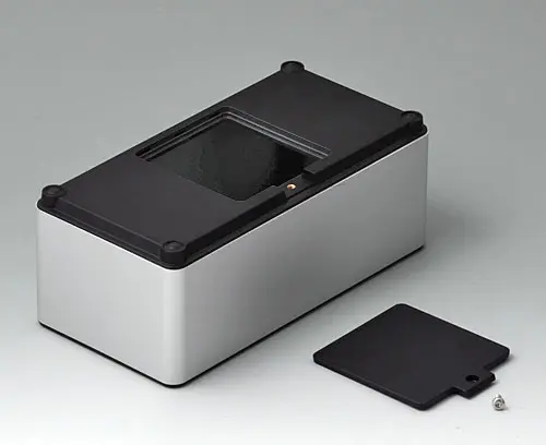 4-part enclosure for many different applications. Sturdy frame made of aluminum, glass bead-blasted and anodized. Plastic parts made of ASA+PC-FR with good UV resistance and high flame resistance. Attachment domes for PCBs and components in the top and bottom parts. Top part with recessed surface to protect the membrane keyboard. Bottom part with opening and screw-down cover: practical for the use of a battery compartment or for access to the interior, e.g. for a memory card or batteries that are mounted directly on the PCB. Battery compartment kit 4 x AA with contact springs, battery clips, button cell holder and wall mounting option as accessories.