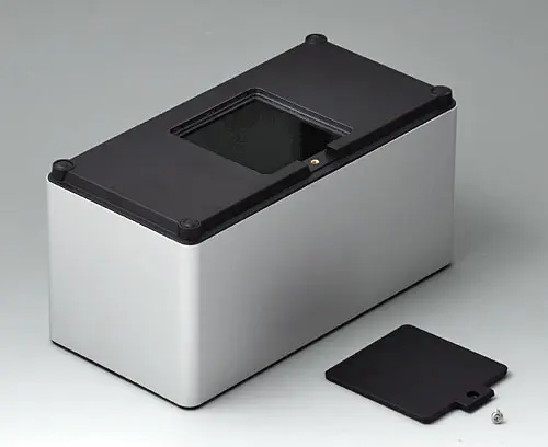 4-part enclosure for many different applications. Sturdy frame made of aluminum, glass bead-blasted and anodized. Plastic parts made of ASA+PC-FR with high UV protection and high flame resistance. Attachment domes for PCBs and components in the top and bottom parts. Top part with recessed surface to protect the membrane keyboard. Bottom part with opening and screw-down cover: practical for the use of a battery compartment or for access to the interior, e.g. for a memory card or batteries that are mounted directly on the PCB. Battery compartment kit 4 x AA with contact springs, battery clips, button cell holder and wall mounting option as accessories.