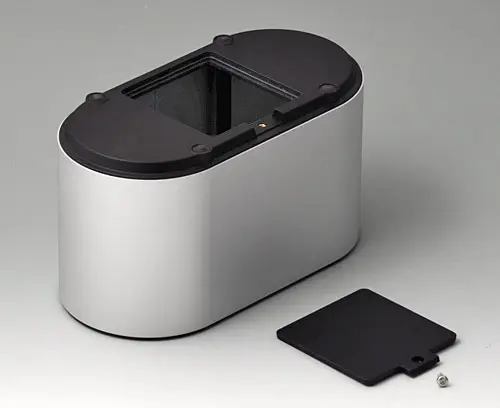 4-part enclosure for many different applications. Sturdy frame made of aluminum, glass bead-blasted and anodized. Plastic parts made of ASA+PC-FR with high UV protection and high flame resistance. Attachment domes for PCBs and components in the top and bottom parts. Top part with recessed surface to protect the membrane keyboard. Bottom part with opening and screw-down cover: practical for the use of a battery compartment or for access to the interior, e.g. for a memory card or batteries that are mounted directly on the PCB. Battery compartment kit 4 x AA with contact springs, battery clips, button cell holder and wall mounting option as accessories.
