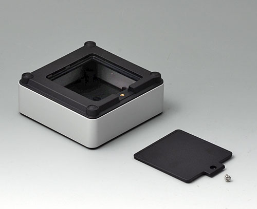4-part enclosure for many different applications. Sturdy frame made of aluminum, glass bead-blasted and anodized. Plastic parts made of ASA+PC-FR with good UV resistance and high flame resistance. Attachment domes for PCBs and components in the top and bottom parts. Top part with recessed surface to protect the membrane keyboard. Bottom part with opening and screw-down cover: practical for the use of a battery compartment or for access to the interior, e.g. for a memory card or batteries that are mounted directly on the PCB. Battery compartment kit 4 x AA with contact springs, battery clips, button cell holder and wall mounting option as accessories.