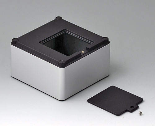 4-part enclosure for many different applications. Sturdy frame made of aluminum, glass bead-blasted and anodized. Plastic parts made of ASA+PC-FR with good UV resistance and high flame resistance. Attachment domes for PCBs and components in the top and bottom parts. Top part with recessed surface to protect the membrane keyboard. Bottom part with opening and screw-down cover: practical for the use of a battery compartment or for access to the interior, e.g. for a memory card or batteries that are mounted directly on the PCB. Battery compartment kit 4 x AA with contact springs, battery clips, button cell holder and wall mounting option as accessories.