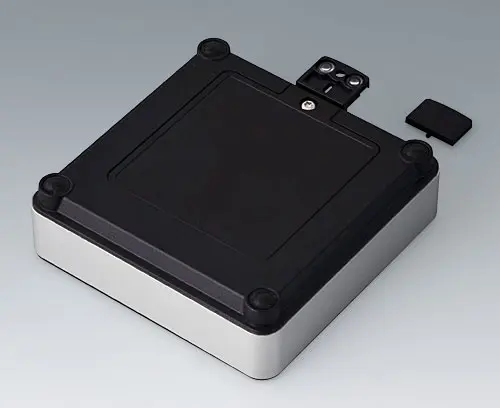 SYNERGY R100 4-part enclosure for many different applications. Sturdy frame made of aluminum, glass bead-blasted and anodized. Plastic parts made of ASA+PC-FR with high UV protection and high flame resistance. Attachment domes for PCBs and components in the top and bottom parts. Top part with recessed surface to protect the membrane keyboard. Bottom part with opening and screw-down cover: practical for the use of a battery compartment or for access to the interior, e.g. for a memory card or batteries that are mounted directly on the PCB. Battery compartment kit 2 x AA with contact springs, battery clips, button cell holder and wall mounting option as accessories.