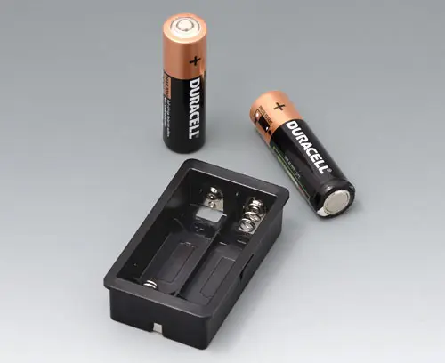 For 2 x 1.5 V mignon-cells (AA). To install a PCB above the battery compartment in the bottom part, the extender (EZ031209) is required.