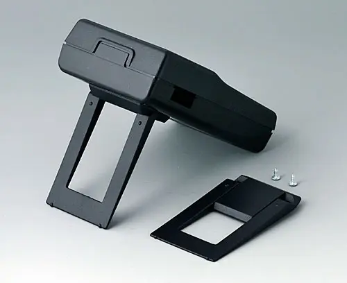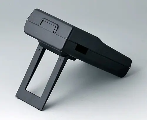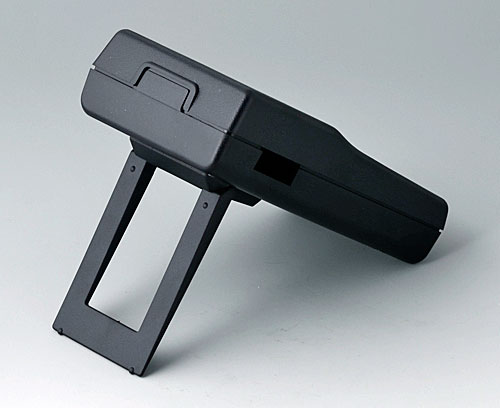 HAND-HELD-BOX P, Vers. I Successfully used case for measuring instruments. With recessed area for imprintings or your logo. Cut-out section for LCD or analogical modules. With battery compartment, accessible from the outside, for 9 V flat battery or 1.5 V baby cell (C) with contacts for soldering. Raised front area to accommodate plugs.