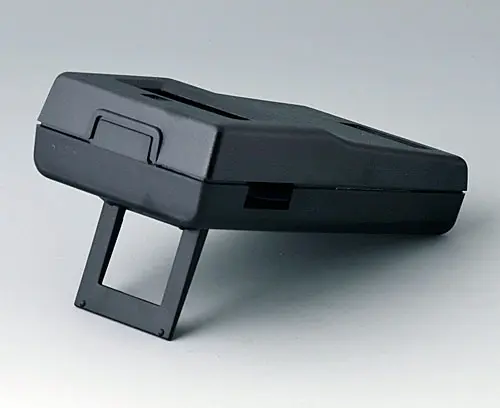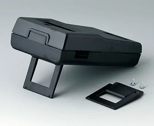 HAND-HELD-BOX P, Vers. I Successfully used case for measuring instruments. With recessed area for imprintings or your logo. Cut-out section for LCD or analogical modules. With battery compartment, accessible from the outside, for 9 V flat battery or 1.5 V baby cell (C) with contacts for soldering. Raised front area to accommodate plugs.