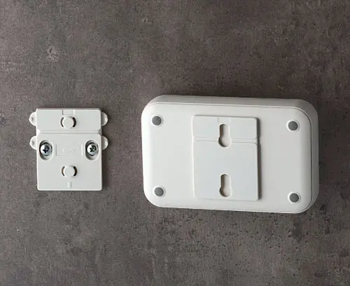 The adapter (1.77" x 2.28") is attached to the enclosure with a double-sided adhesive foil*. This makes it possible to mount the enclosure quickly and easily on the holder, which can be screwed to the wall - attachment with adhesive foils* is optionally also possible here (separate article available as an accessory). Removal protection by means of a locking pin.