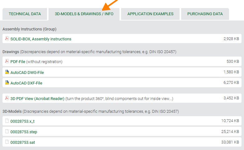 Locate and click on the  "3D-MODELS & DRAWINGS/INFO" tab to reveal all the available files for the product.